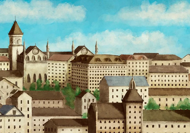Charming digital painting depicting a fictional present-day Austrian city with a classical oil & canvas aesthetic for The von Trapps band website.